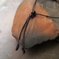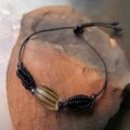 二本の紐をまとめるビーズ、紐の先端のビーズ、共にヴェネチアンシードビーズです。