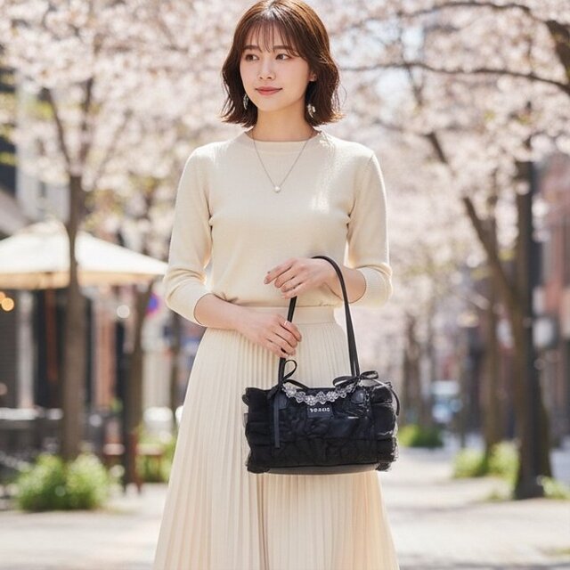 バッグの両面は、オーガンジー生地でできており、すべて手作業で作られています。また、表面損傷を避けるために職人が細心の注意を払って作られています。生産工程からの繊細さと可憐さが融合したブリリアントなバッグとなります。