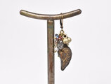 アフガニスタンメタルとブラックルチル、ロンドンブルートパーズ、たわわなストーンビーズ、民族鈴を繋いだ片耳ピアスです。