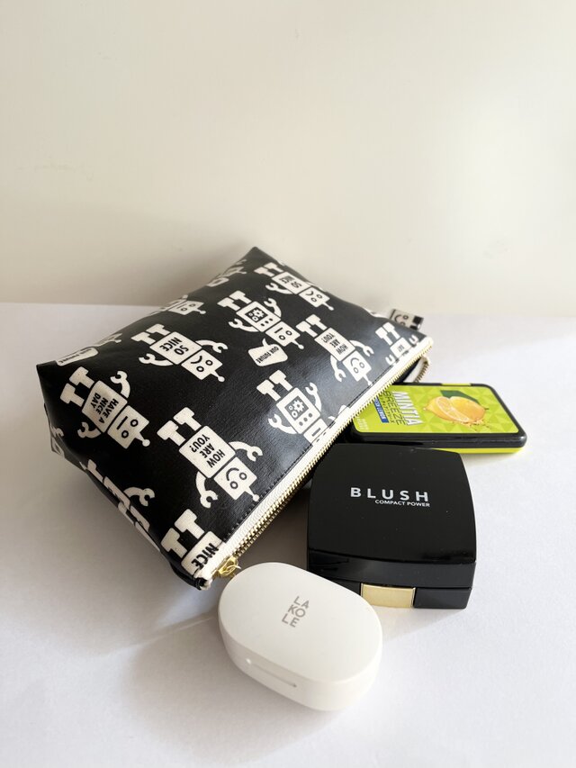 ラミネートポーチ1枚仕立ての物が多いですが、裏地つきにして内側の汚れを防ぎスッキリ丈夫にしています。