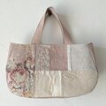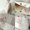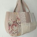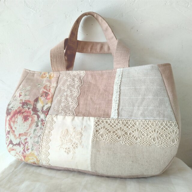 くすみピンクの薔薇模様の生地と異なるタイプのリネンやレース地をパッチワークし、レースを添えたパッチワークバッグです。