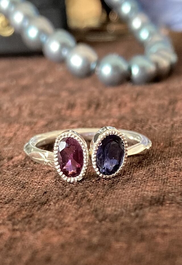 ☆隣に並ぶのは紫がかった鮮やかなワインレッドのロードライトガーネット。赤系ガーネットパイロープとアンマンディンの中間に位置し、赤系ガーネットの中でとても人気があります。