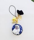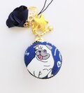 ブルーの綿オックス生地に可愛いラブリーパグちゃん柄のマカロンポーチストラップです。