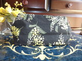 黒地にミモザの花柄の中厚コットン地で作った横長六角形のポーチです。