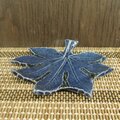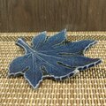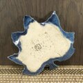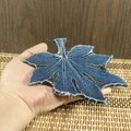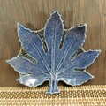 陶器の葉っぱ皿.ヤツデの葉から型どりしました.ルリ色の釉をかけました.写真の調整がうまくいかず実物は少し印象が違うかもしれませんが,「ルリ」には間違いありません.