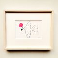 シンプルな線で描いた鳥がピンクの花を運んでいます。