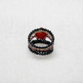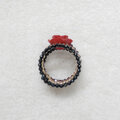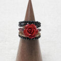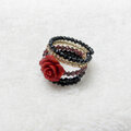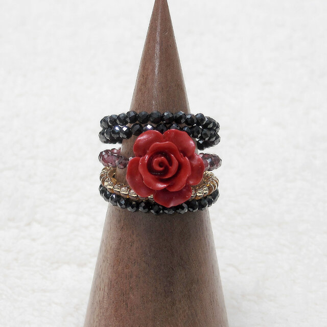 練り珊瑚の赤い薔薇とロードライトガーネット、ブラックスピネルの5連リング(指輪のサイズ:フリーサイズ、形状記憶ワイヤー)