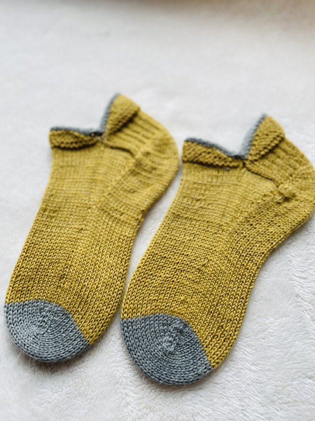 ちなみに竹串か?!ってくらい細い針で編んでるので意外と薄いです。普通の靴下と同じように履けますよ♪