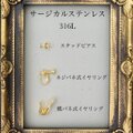 サージカル(surgical)が「外科の、手術の」という意味で、医療用工具にも使用されるほど優れた特性を持った金属のことです。サージカルステンレスは、JIS規格(日本産業規格)で「316L」と表記されます。耐食性がとても高いので、金属成分が溶け出しにくく、金属アレルギーになりにくい素材です。