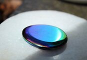 レインボーオーラオブシディアンはオブシディアンにオーラ加工を施したものです。ブラックアクアオーラとも呼ばれます。オブシディアンに真空蒸着処理という特殊な加工技術で、金やチタンなどの合金を蒸着させてあります。これにより、ビスマスの結晶のような虹色の輝きが現れます。さらに、チタンは、オブシディアンであるブラック ベルベットに保護要素をもたらします。