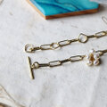 チェーンは手首のサイズに合わせて3か所で調整可能。金具はTバーなので装着が簡単で外れにくいです。余ったチェーンが手首から垂れる感じも可愛いデザイン。
