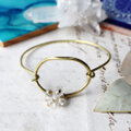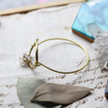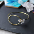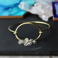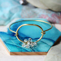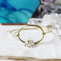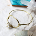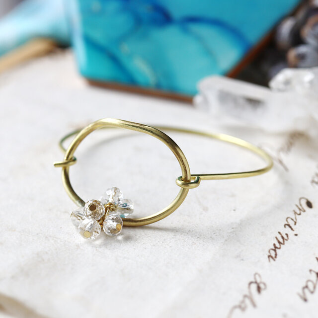 氷を切り出したような透明感のクォーツが、お花のように集まって、ゆるい真鍮のわっかからぶら下がるバングルです。