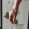 手首のサイズに合わせて2か所で調整可能。金具はTバーなので装着が簡単で外れにくいです。余ったわっかが手首から垂れる感じも可愛いデザイン。