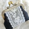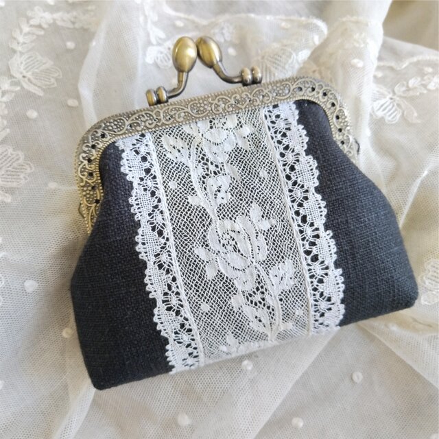 黒リネンにアンティークレースをのせたシックで可愛いがま口ポーチです。
