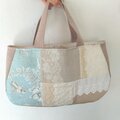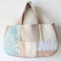 このイギリス製のインテリアファブリックをメインに金沢レース刺繍生地、ドットグログラン、リネンなどをパッチワークしました。