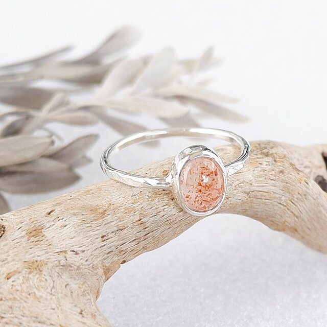 赤っぽいレピドクロサイト(鱗鉄鉱)を内包した小粒の水晶を、アームにテクスチャを付けた華奢なリングに仕上げました。