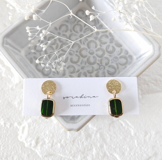 ゴールド✕緑のガラスのシンプルなアクセサリーです。