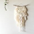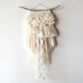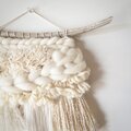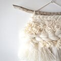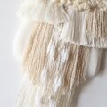 みるく色のふわふわクロスブレッドと上質なメリノウールを使用し、極太モヘアやコットン、ファンシーヤーン等と組み合わせた、ボリュームと存在感のあるタペストリー。