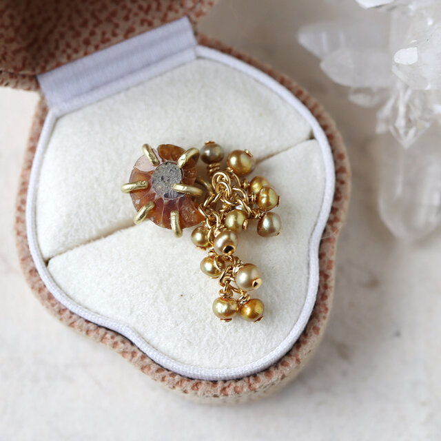 ベビーパールのチャームを合わせると、まるでそこに生きていたアンモナイトが触手を伸ばすよう。