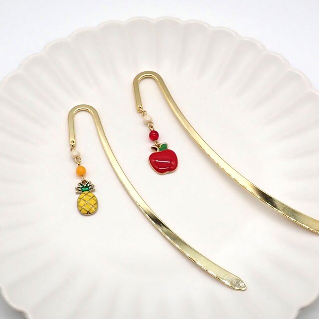 カラフルなチェコビーズとフルーツチャームが揺れる可愛いブックマーカーです。