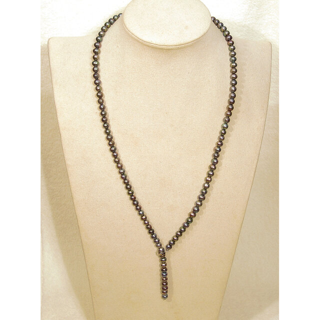 照りの美しい本真珠(淡水パール、マルチカラー)のYネックレスです。南洋真珠の様なピーコックグリーンなど、とても美しい色合いが見られ、縞もほぼ見られない高品質の本真珠です。