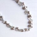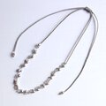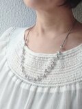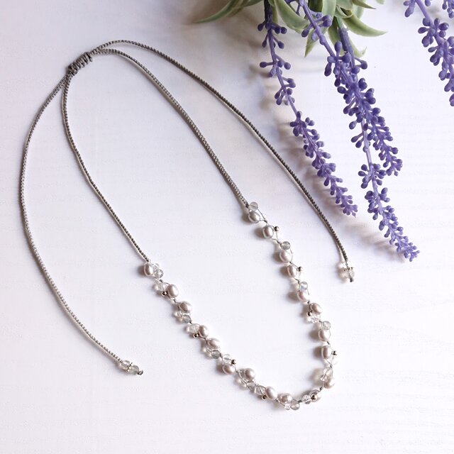 グレー染の淡水パールをラブラドライトや水晶と一緒に編み込んだライトグレーのフリーサイズネックレスです。