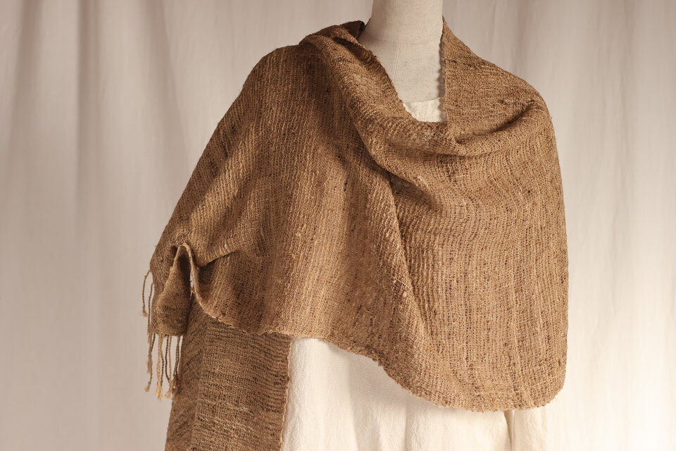 糸ですが、その分軽く、独特の風合いや野生趣に富んだストールに織り上がりました。