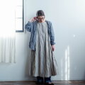 新しい鍵盤タックワンピース、はっきり申し上げて好みです!皆さんこちらのデザイン、お腹部分だけタックは入っていないのを気が付きましたか?実際に着用するとタックが無いことでお腹をスッキリ無かったかのように見せながら、脇に掛けての伸びるタックのボリュームのお陰で体の線を出さないよう工夫されています。簡単に説明しますと、横から見たスタイルがスッキリ見えるのです。しかもお腹のVステッチが甘さを抑えてくれるのでデニムと合わせると絶妙なワーク感が出ます。しかもノースリーブは重ね着派には丁度いいです。えーと、欲しいです!何色にしようかな。着丈は膝下17cm程、胸囲は両手親指全体で摘めるくらいのゆとりがあります。アームホールがやや広めなので大きく胸を突き出してても窮屈感は全くありません。
