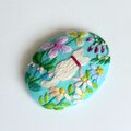 サーモンピンクの地に黒い花の刺繍、ありそうでなかったこの色のとりあわせ、すてきなブローチでした。
