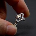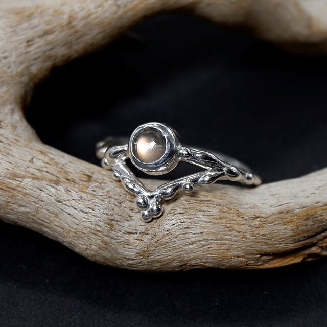 光の当たる角度によってオレンジ系の輝きを浮かべるアンデシンラブラドライトを個性的なデザインリングに仕上げました。