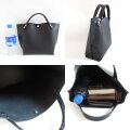 ◎両サイドの底マチの幅を広く取り扇状のシルエットにマッチする幅広でショートなハンドルを
