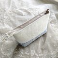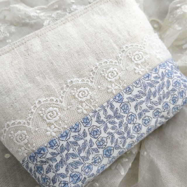 アイボリーリネンとリバティのスリーピングローズを組み合わせ、チュールレースを添えたポーチです。