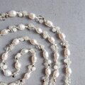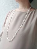 やや大粒(長さ8mmくらい)の淡水パールをメインに、ムーンストーンや水晶を一緒にシルクコードで編み込んだエンドレスタイプのロングネックレスです。