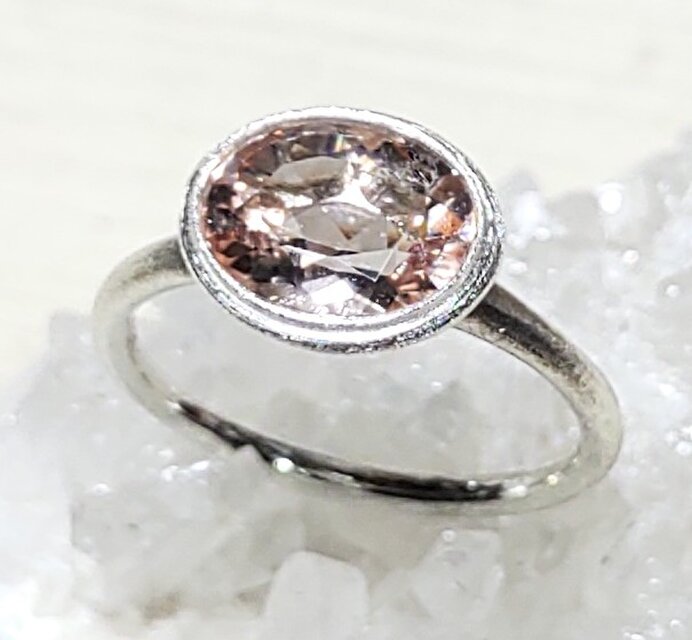 桜や桃を思わせるような可愛いピンクのマダガスカル産モルガナイトのナチュラルな925リング*細かく煌めく液膜インクルージョンがみられますがこの大きさで色合い、透明度、煌めきともに優れた美しい天然石をお楽しみ下さい*モルガナイトは『幸せな結婚』の象徴、柔軟な心を鍛え精神の安定を高めるといわれます*石座に向かい太さを増すリングに二重ベゼルのデザイン、リングはアンティークマット仕上げ、12~20号(推奨サイズ)の範囲を目安に調整可能、サイズ確定後にマットな覆輪の石留めを致します*通常、黒化遅延処理を施しますが銀そのものの変化をお好みの場合は処理不要とお申し付けください*黒化防止ロジウムやK14・K18・K18lunapinkコーティングご希望の場合は承ります(別途1000円)