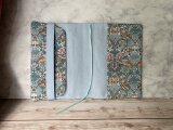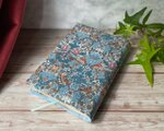 イギリスの工芸家ウィリアム・モリスがファブリックのためにデザインした図案を、リバティ社がプリントした生地を使用しています。元の図柄よりも縮小されているため、手元で扱うブックカバーには適したサイズ感になっています。