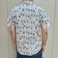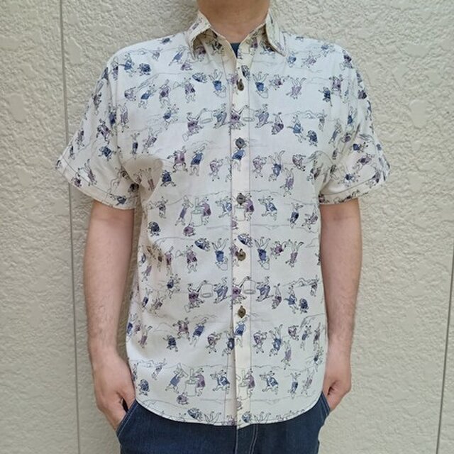 新作手作り半袖和柄シャツ(鳥獣戯画)生成り