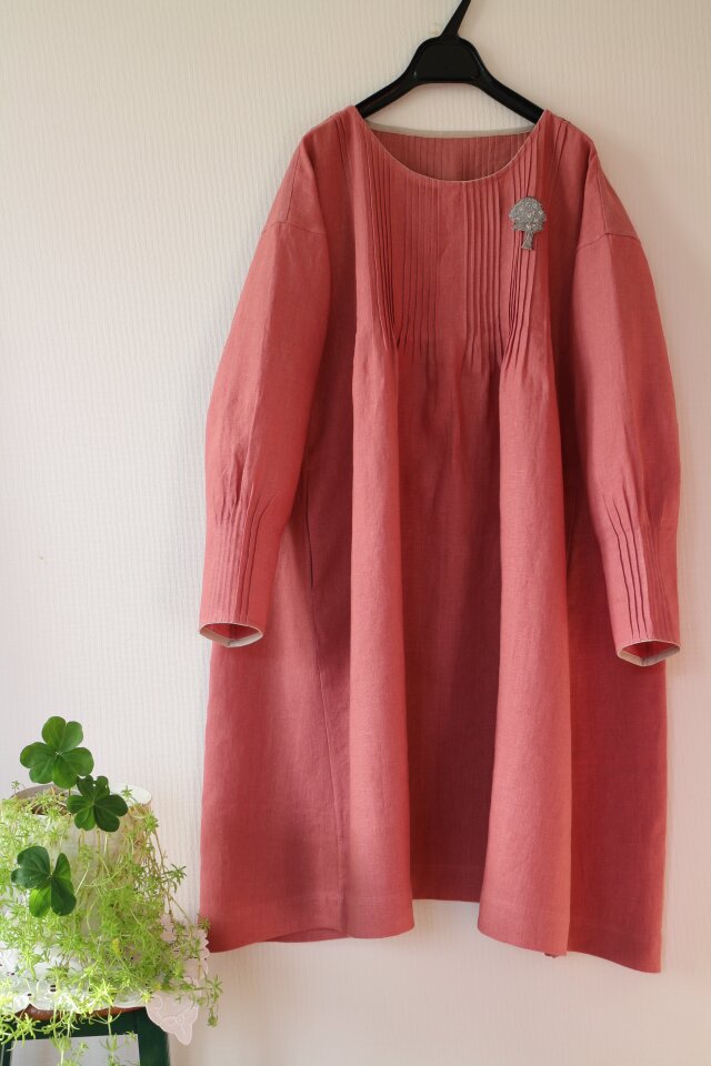 25番手リネン100%バイオ加工を施しており、ヴィンテージ感のある生地でピンタックワンピース作りました。