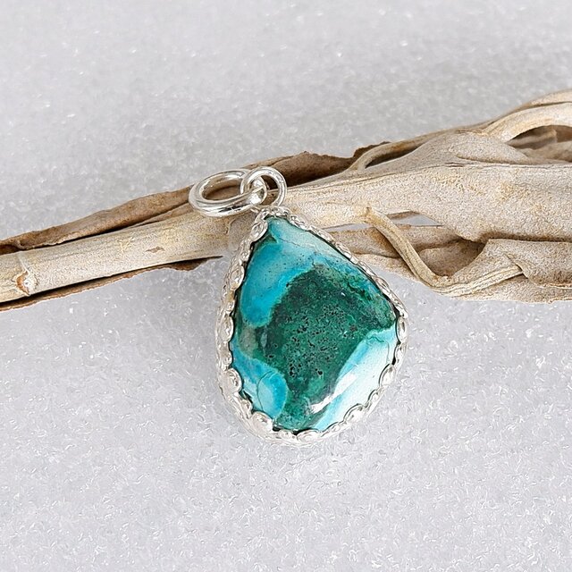 個性的な模様の美しいアズライトとマラカイトの混ざり合ったカボションルースを、飾り枠でシンプルなペンダントに仕上げました。