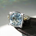 爽やかなブルーのトパーズを、18金で飾った唐草と透かし模様の台座にセットしました。