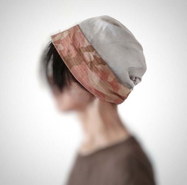 綿麻の生成のリバーシブルのターバン風帽子です。