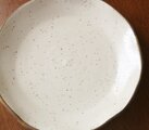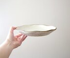 焼成すると斑点模様が現れ、土物特有のあたたかさを感じさせてくれる白御影土を使用し、フリルのような柔らかなフォルムのお皿を制作しました。