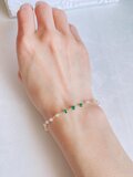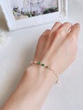 発色の良いエメラルドに、淡いパステルグリーンのプレナイトと淡水真珠を合わせ、華やかさと品のある大人可愛いブレスレットにしました。