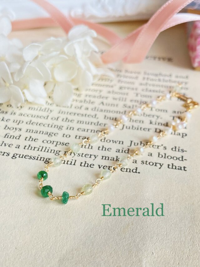 【5月誕生石】14kgf エメラルドとプレナイト、淡水真珠のブレスレット ac/667