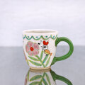 明るく楽し気なユーモラスな鳥と花を描いたマグカップです。