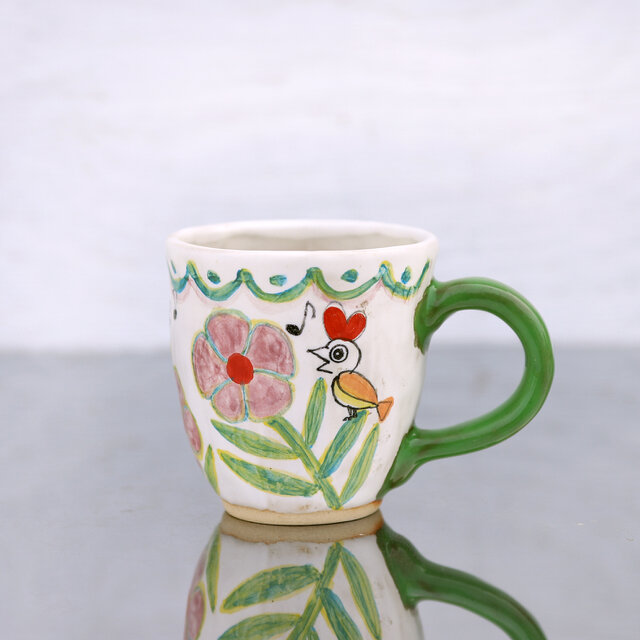 金継ぎ・花と鳥の色絵マグ(緑の取っ手)
