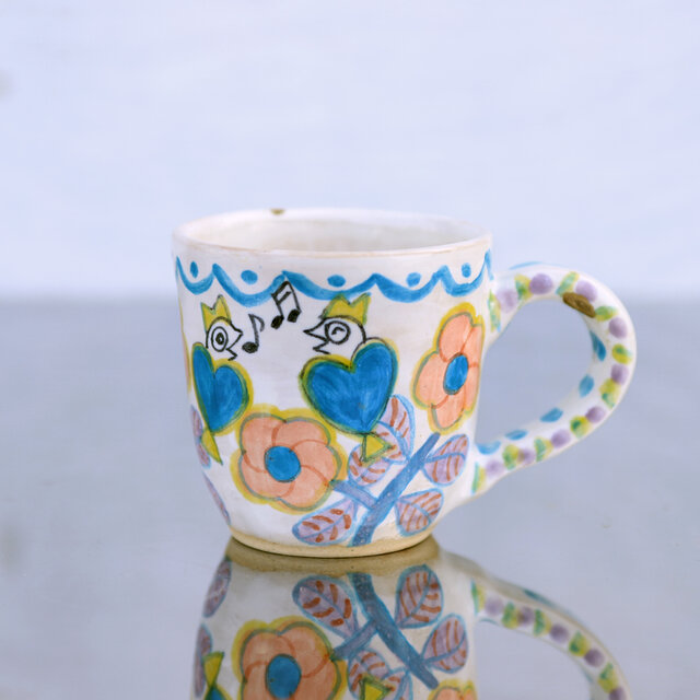 楽し気に歌うハート鳥と赤い花を描いたマグカップです。