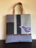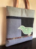 帯地の無地、縞、型染めを剥ぎ、やはり帯地の鳥の模様部分を切り取って、ミシンアップリケで配しました。