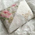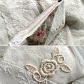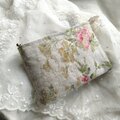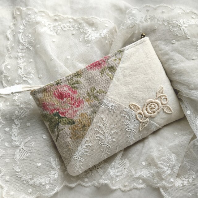 クラシックな薔薇模様リネン、アンティーク刺繍チュールレース、ダマスク織りの布をつないでポーチにしました。