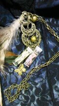 ●造り:プラスチック細ボトルに虫を入れ樹脂で固め、金属パーツに繋いでいます。鳥の羽も2本ぶら下げました。