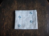 ブルーの四角い柄の刺繍の入った麻のコンパクトなサニタリーケースです。